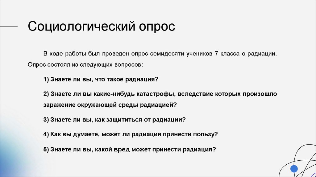 Социологический опросВ ходе работы был проведен опрос семидесяти учеников 7 класса о радиации.