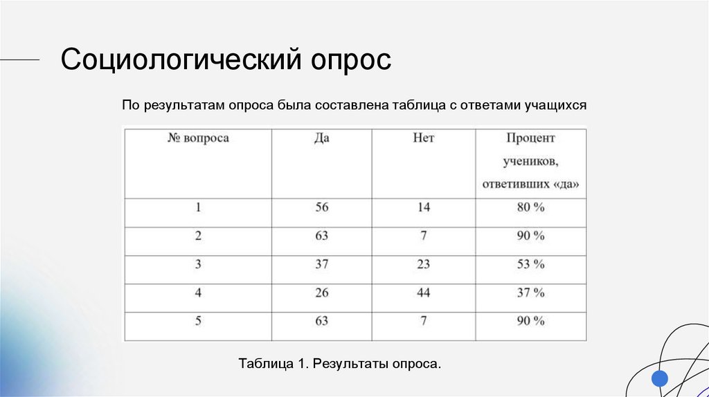Социологический опросПо результатам опроса была составлена таблица с ответами учащихся