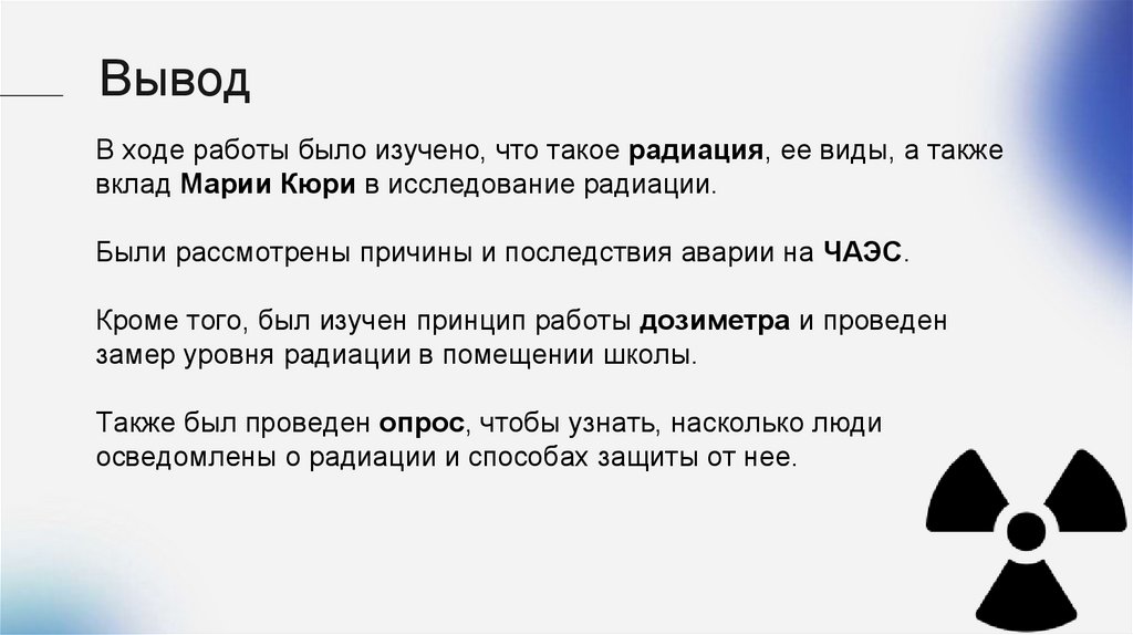 ВыводВ ходе работы было изучено, что такое радиация, ее виды, а также