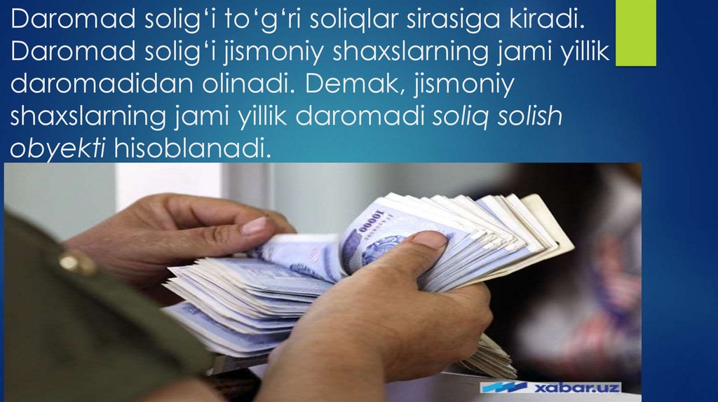 Daromad solig‘i to‘g‘ri soliqlar sirasiga kiradi.Daromad solig‘i jismoniy shaxslarning jami yillik
