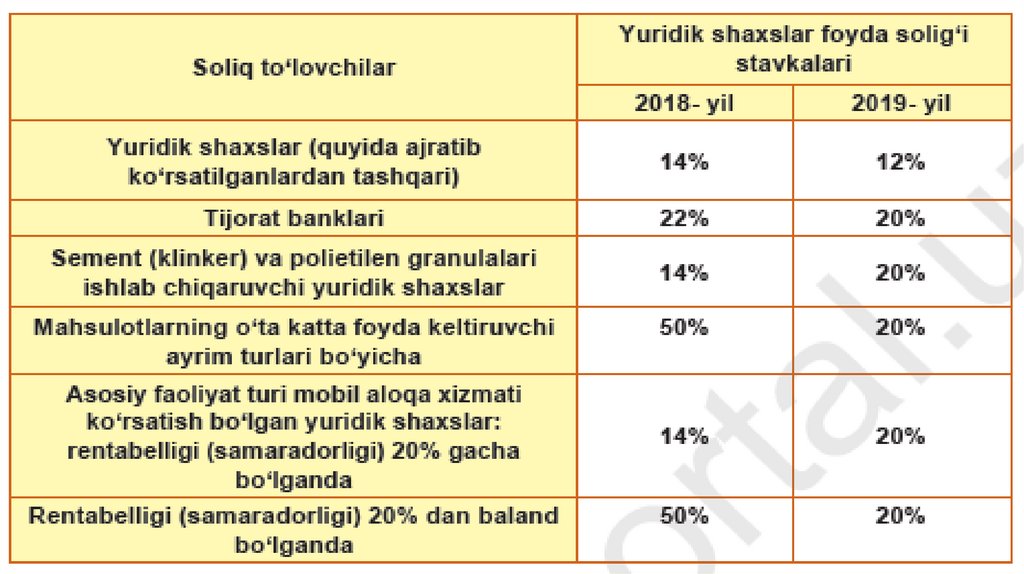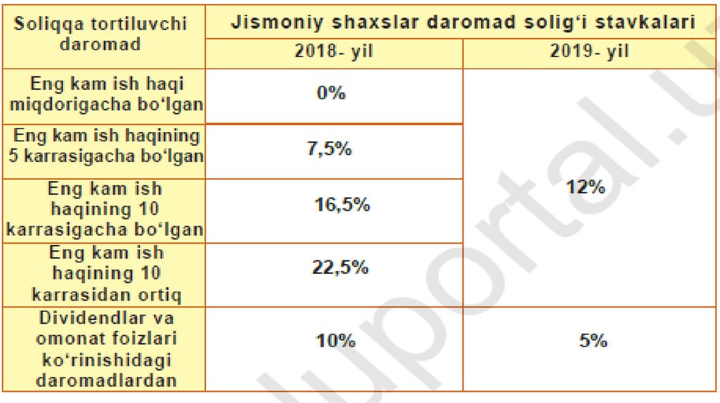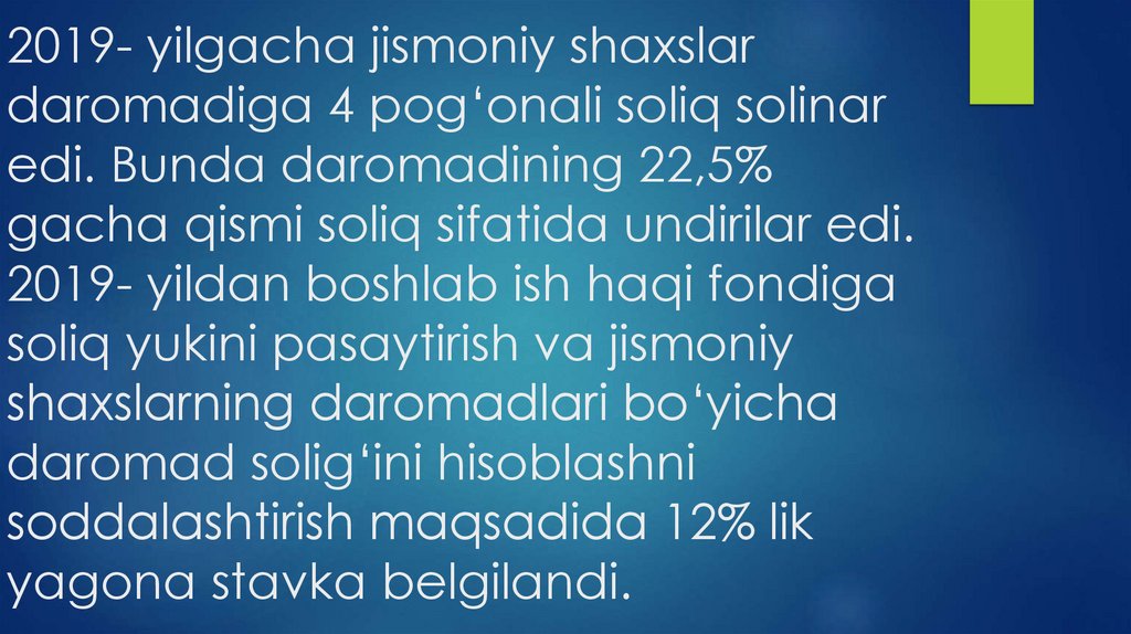 2019- yilgacha jismoniy shaxslardaromadiga 4 pog‘onali soliq solinar