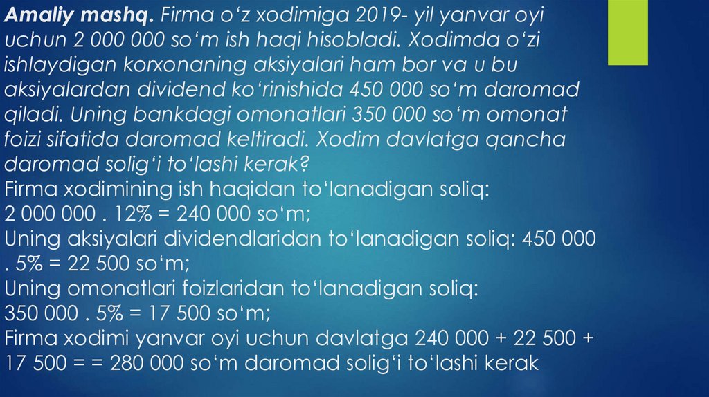 Amaliy mashq. Firma o‘z xodimiga 2019- yil yanvar oyiuchun 2 000 000 so‘m ish haqi hisobladi. Xodimda o‘zi