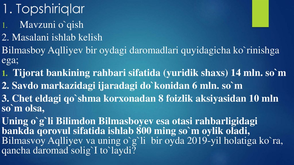 1. Tijorat bankining rahbari sifatida (yuridik shaxs) 14 mln. so`m