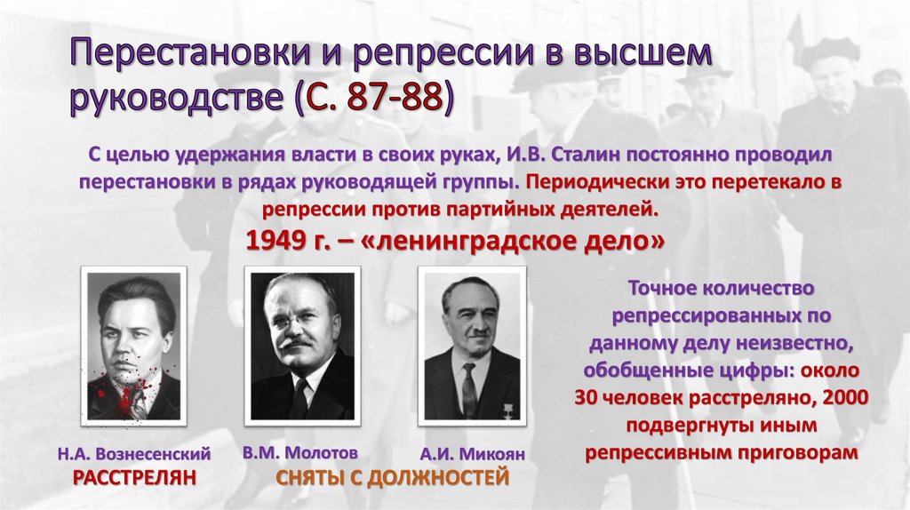 С целью удержания власти в своих руках, И.В. Сталин постоянно проводилперестановки в рядах руководящей группы. Периодически это перетекало в