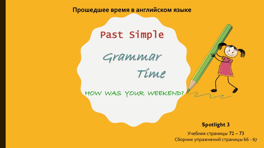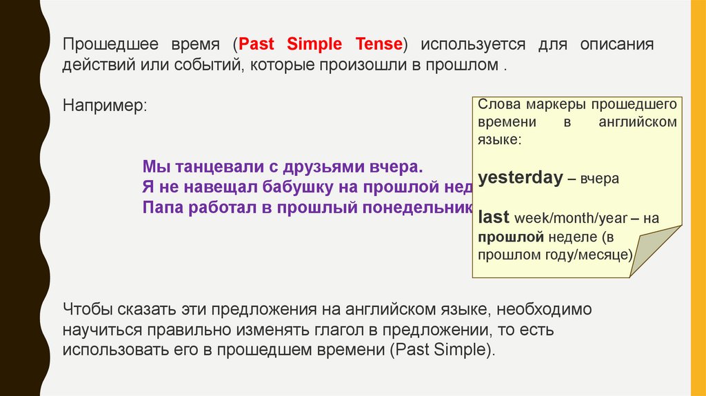 Прошедшее время (Past Simple Tense) используется для описаниядействий или событий, которые произошли в прошлом .