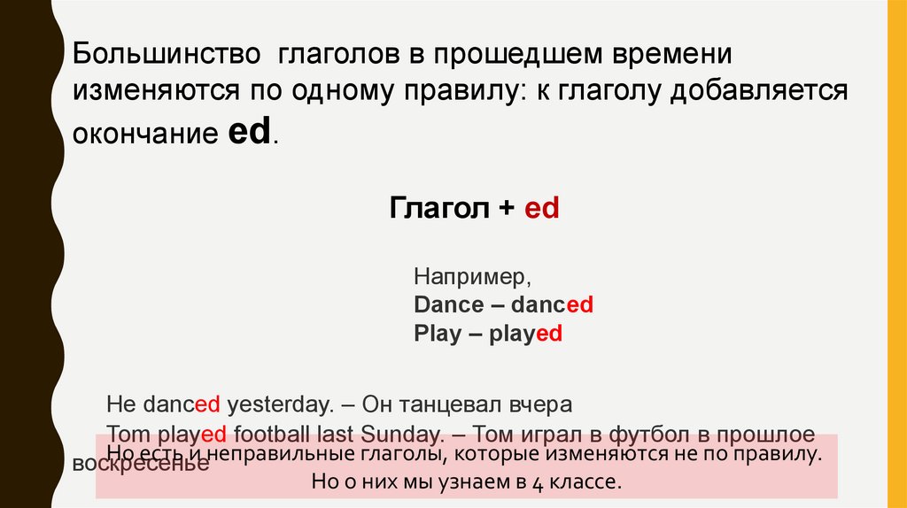 Большинство глаголов в прошедшем времениизменяются по одному правилу: к глаголу добавляется