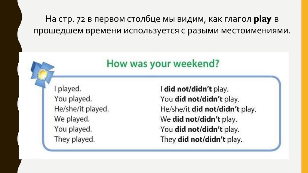 На стр. 72 в первом столбце мы видим, как глагол play впрошедшем времени используется с разыми местоимениями.