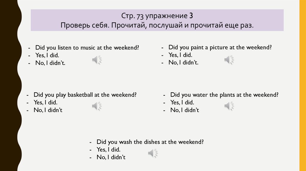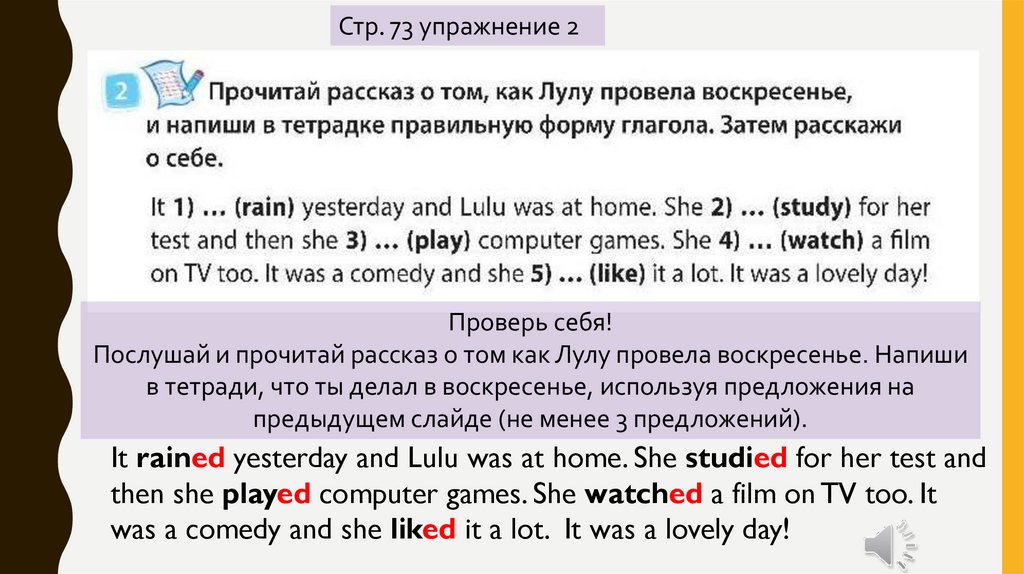 Стр. 73 упражнение 3Проверь себя. Прочитай, послушай и прочитай еще раз.