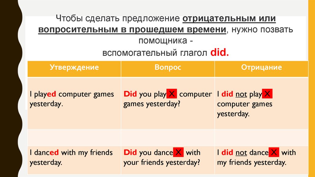Чтобы сделать предложение отрицательным иливопросительным в прошедшем времени, нужно позвать