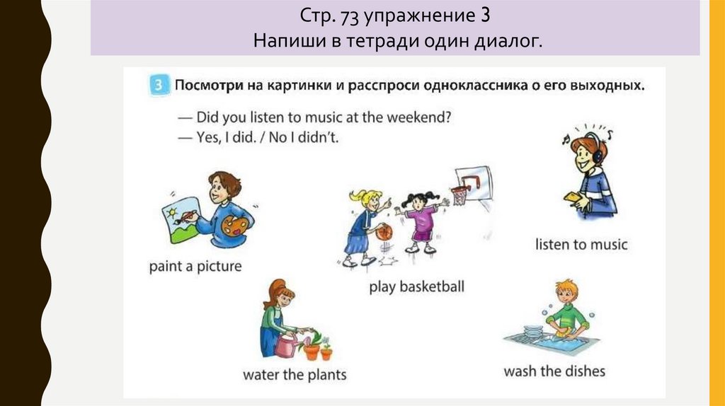 Стр. 73 упражнение 3Напиши в тетради один диалог.