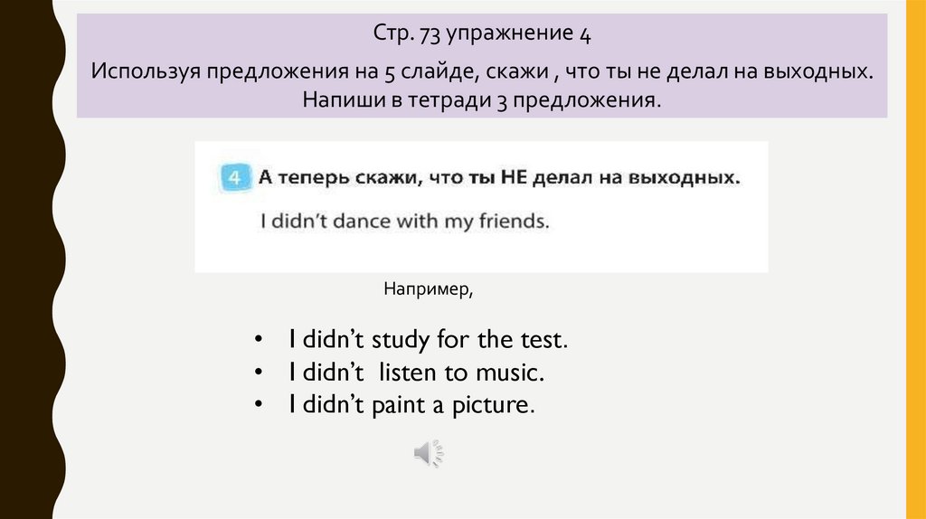 Стр. 73 упражнение 4Используя предложения на 5 слайде, скажи , что ты не делал на выходных.