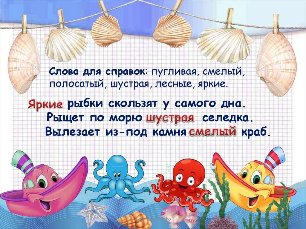 Слова для справок: пугливая, смелый,полосатый, шустрая, лесные, яркие.