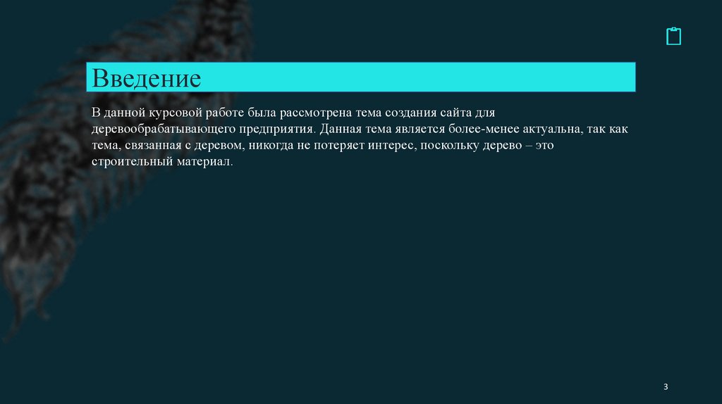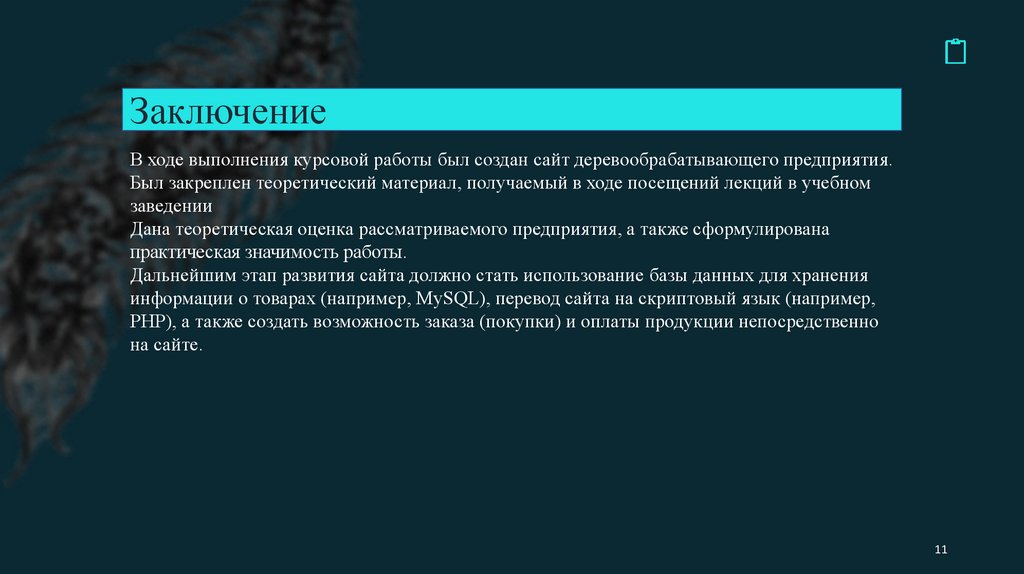 ЗаключениеВ ходе выполнения курсовой работы был создан сайт деревообрабатывающего предприятия.