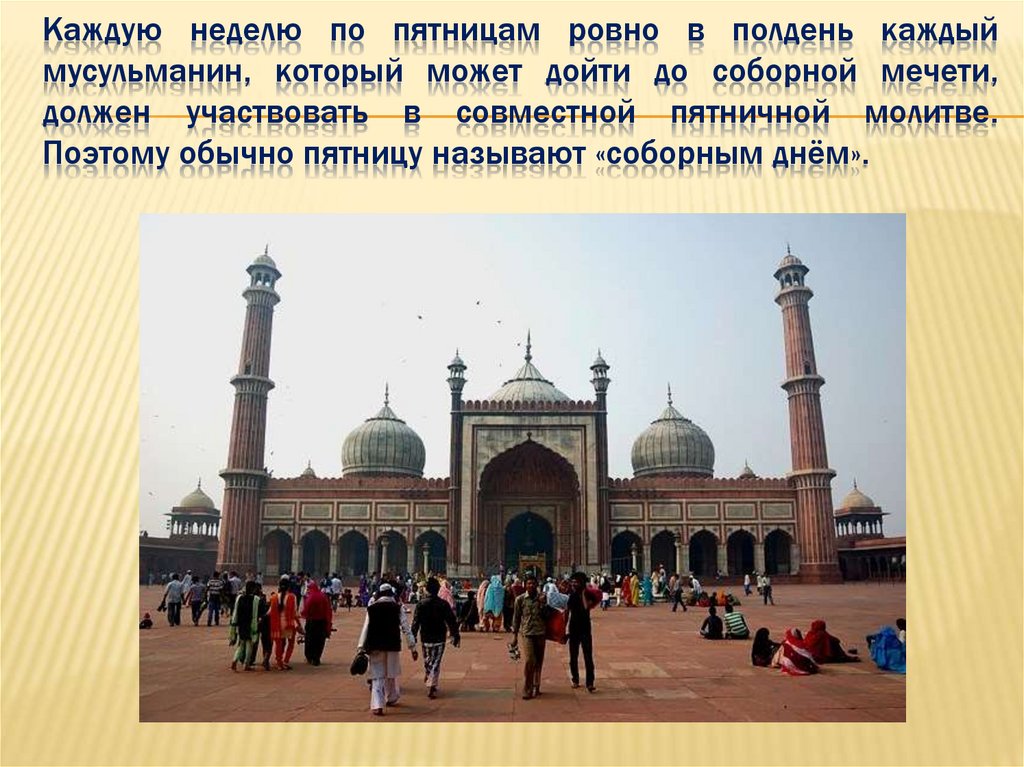 Каждую неделю по пятницам ровно в полдень каждыймусульманин, который может дойти до соборной мечети,