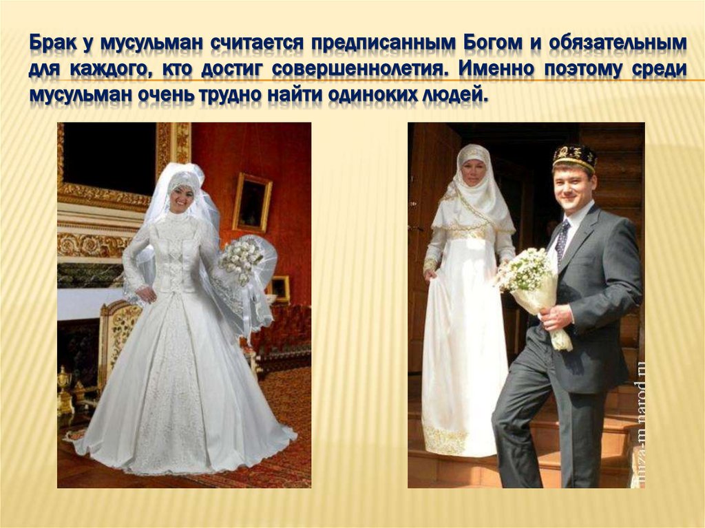 Брак у мусульман считается предписанным Богом и обязательнымдля каждого, кто достиг совершеннолетия. Именно поэтому среди