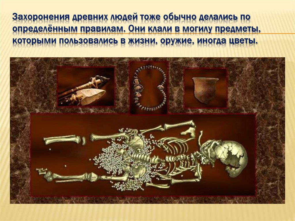 Захоронения древних людей тоже обычно делались поопределённым правилам. Они клали в могилу предметы,