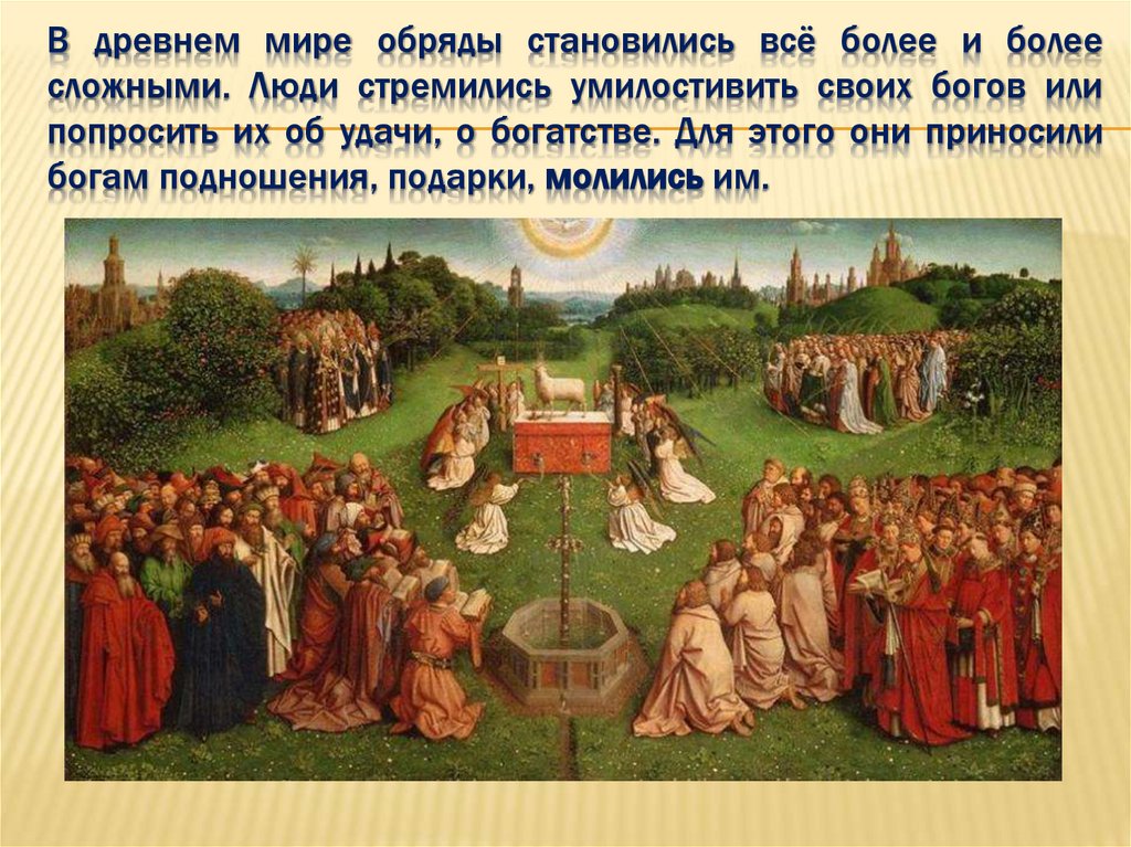 В древнем мире обряды становились всё более и болеесложными. Люди стремились умилостивить своих богов или