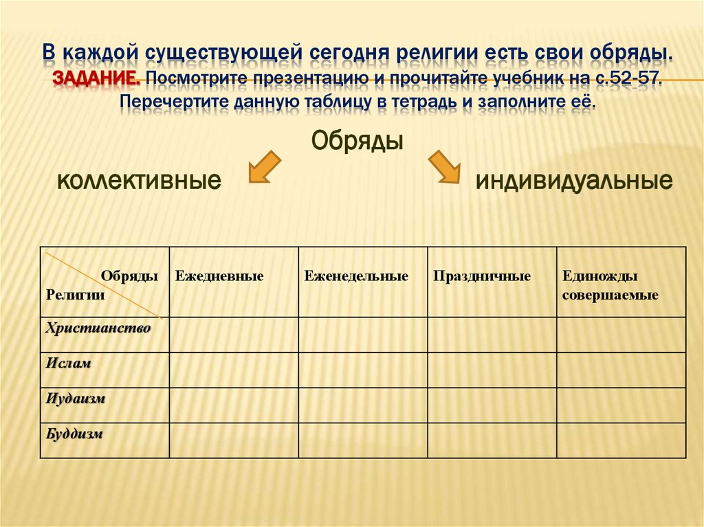 В каждой существующей сегодня религии есть свои обряды.ЗАДАНИЕ. Посмотрите презентацию и прочитайте учебник на с.52-57.