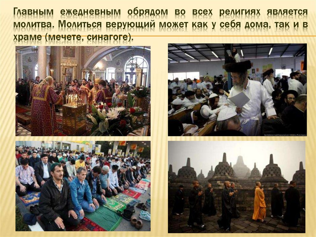 Главным ежедневным обрядом во всех религиях являетсямолитва. Молиться верующий может как у себя дома, так и в