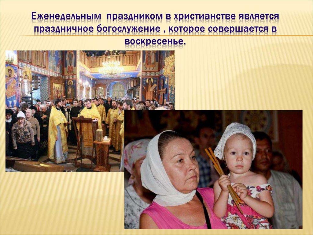 Еженедельным праздником в христианстве являетсяпраздничное богослужение , которое совершается в