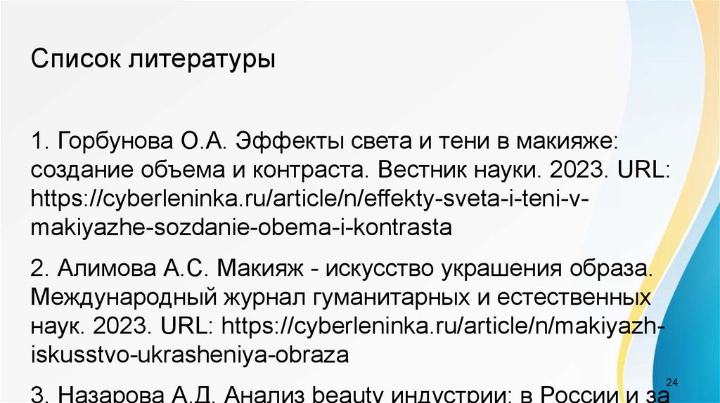 Список литературы1. Горбунова О.А. Эффекты света и тени в макияже: