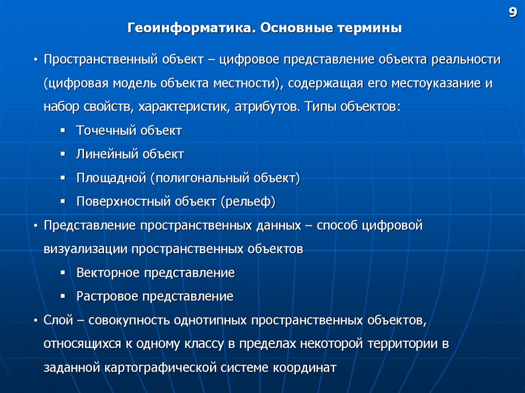 Геоинформатика. Основные термины• Пространственный объект – цифровое представление объекта реальности