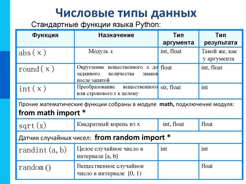 Числовые типы данныхСтандартные функции языка Python: