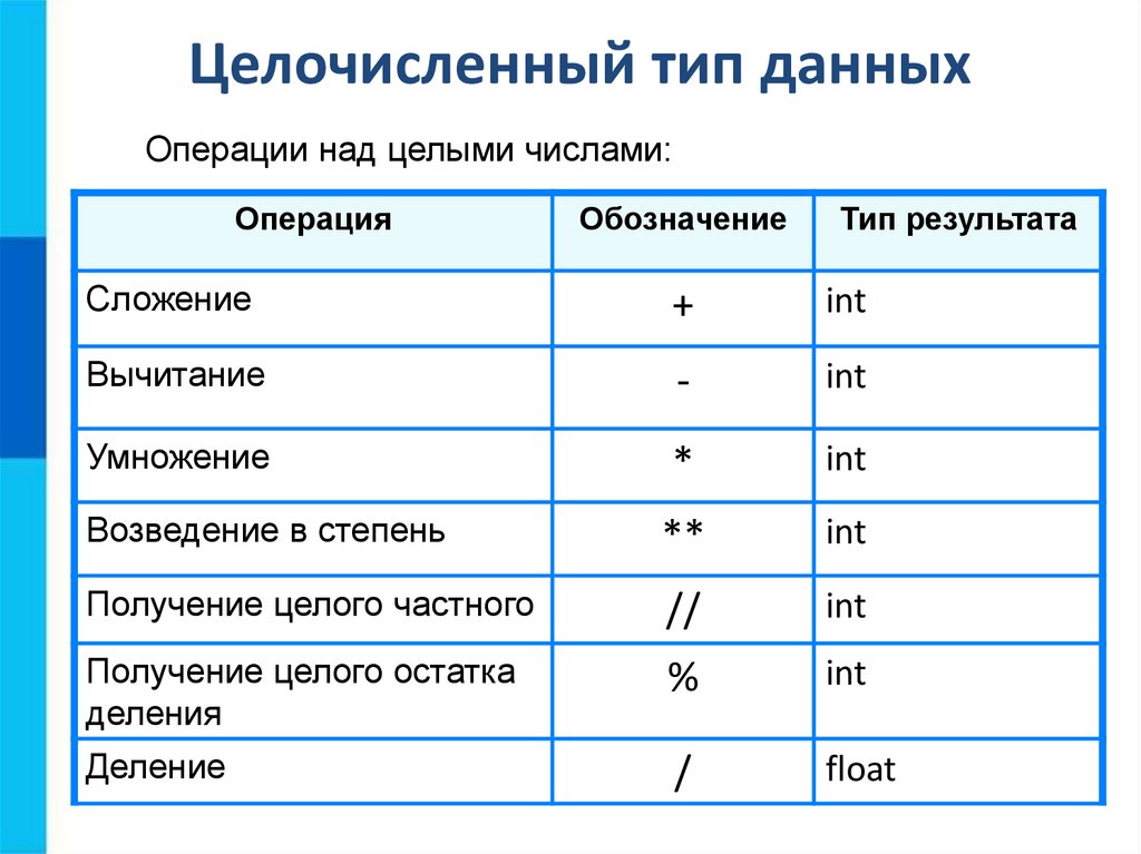 Целочисленный тип данныхОперации над целыми числами: