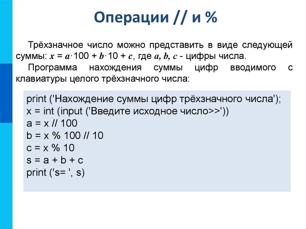 Операции // и %Трёхзначное число можно представить в виде следующей