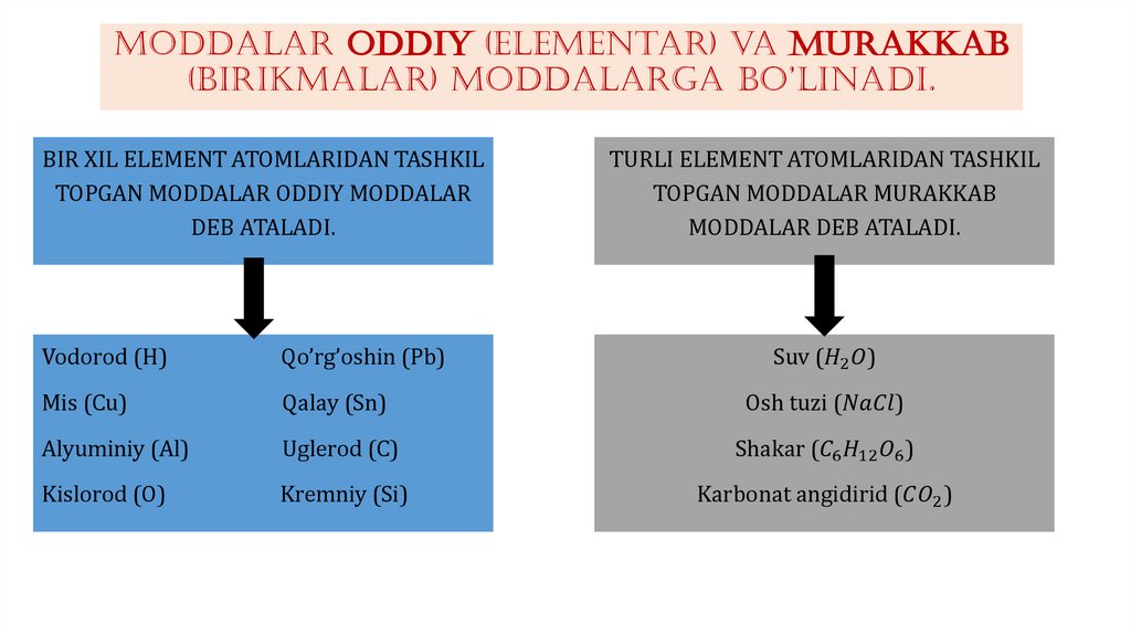 Moddalar oddiy (elementar) va murakkab(birikmalar) moddalarga bo’linadi.