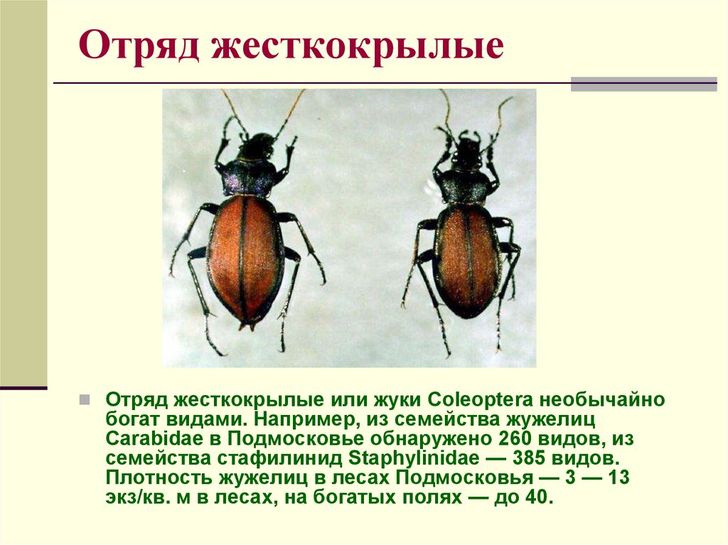 Отряд жесткокрылые или жуки Coleoptera необычайнобогат видами. Например, из семейства жужелиц