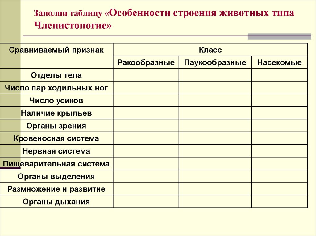 27. Заполни таблицу «Особенности строения животных типа Членистоногие»