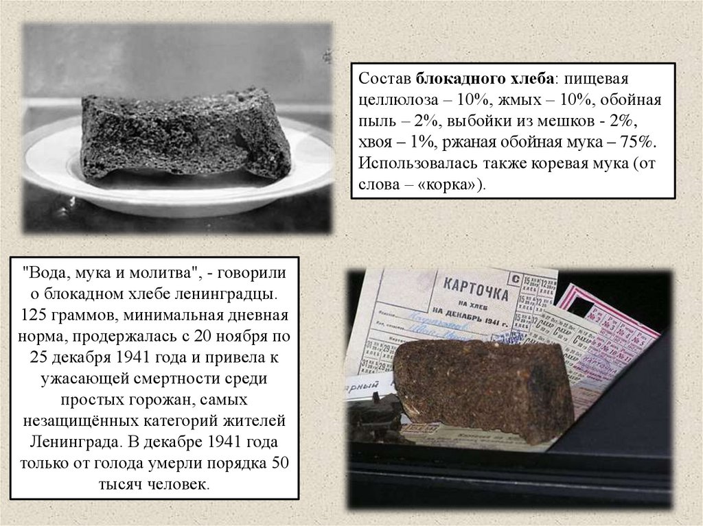 Состав блокадного хлеба: пищеваяцеллюлоза – 10%, жмых – 10%, обойная