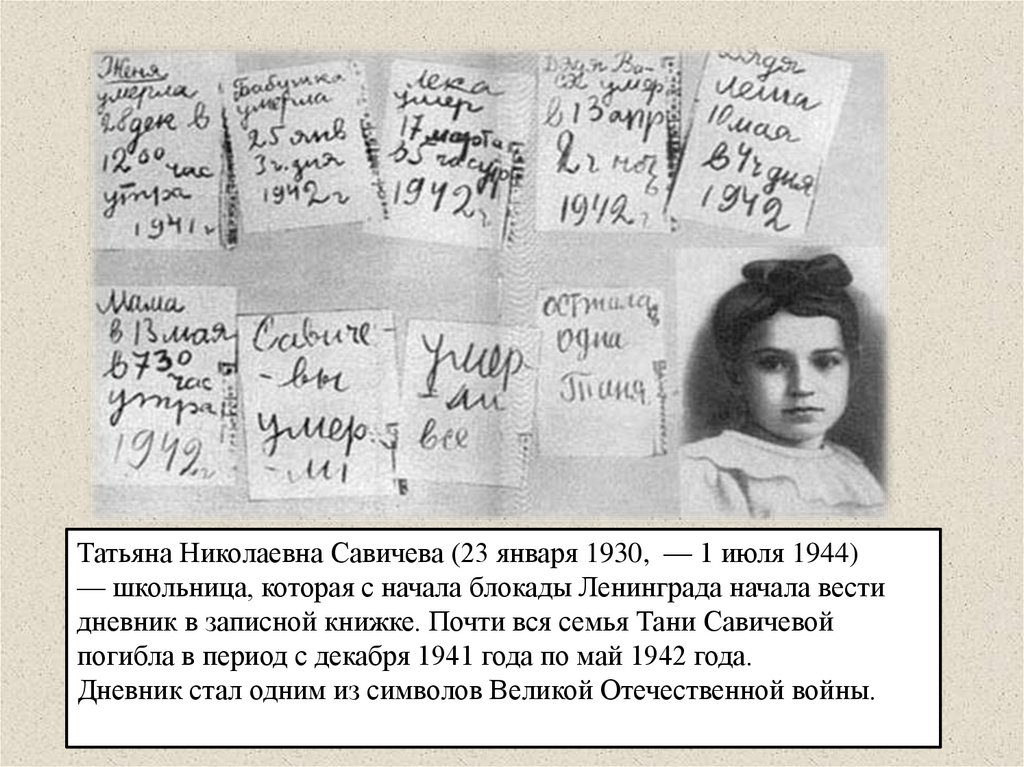 Татьяна Николаевна Савичева (23 января 1930, — 1 июля 1944)— школьница, которая с начала блокады Ленинграда начала вести
