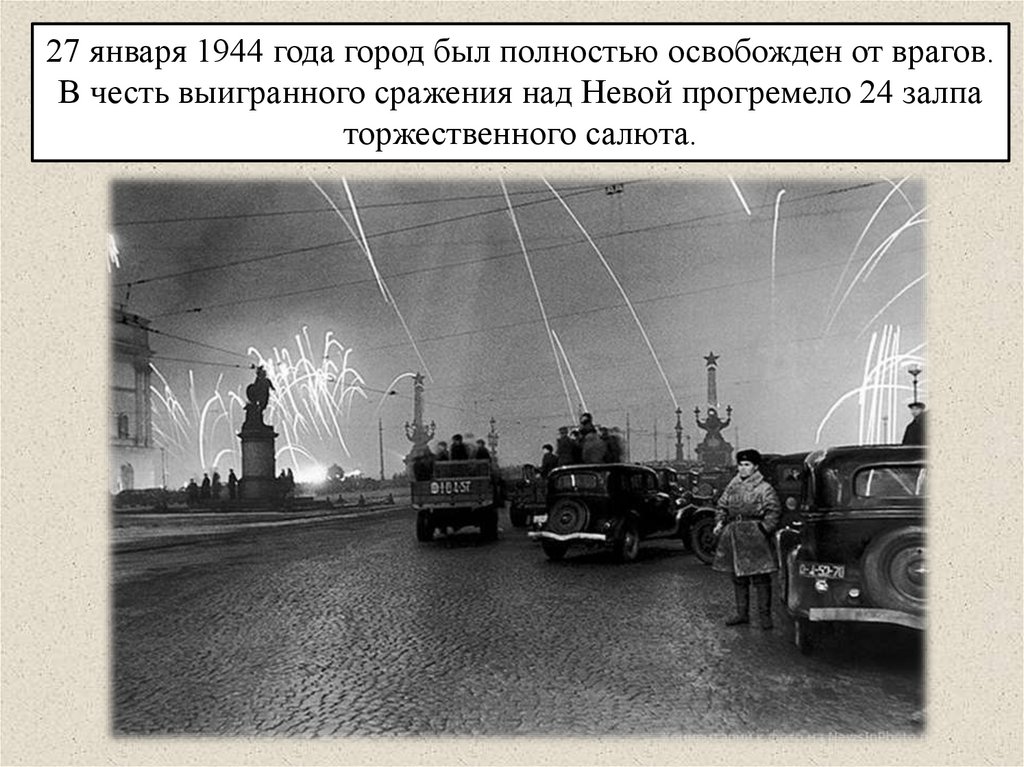 27 января 1944 года город был полностью освобожден от врагов.В честь выигранного сражения над Невой прогремело 24 залпа