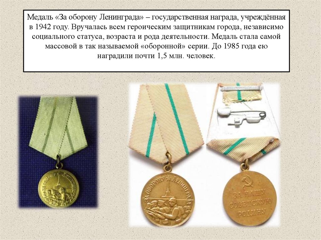 Медаль «За оборону Ленинграда» – государственная награда, учреждённаяв 1942 году. Вручалась всем героическим защитникам города, независимо