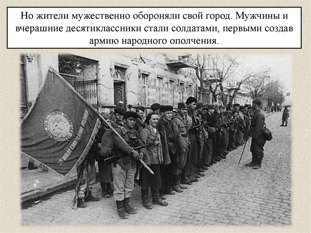 Но жители мужественно обороняли свой город. Мужчины ивчерашние десятиклассники стали солдатами, первыми создав