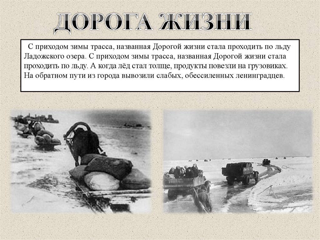 С приходом зимы трасса, названная Дорогой жизни стала проходить по льдуЛадожского озера. С приходом зимы трасса, названная Дорогой жизни стала