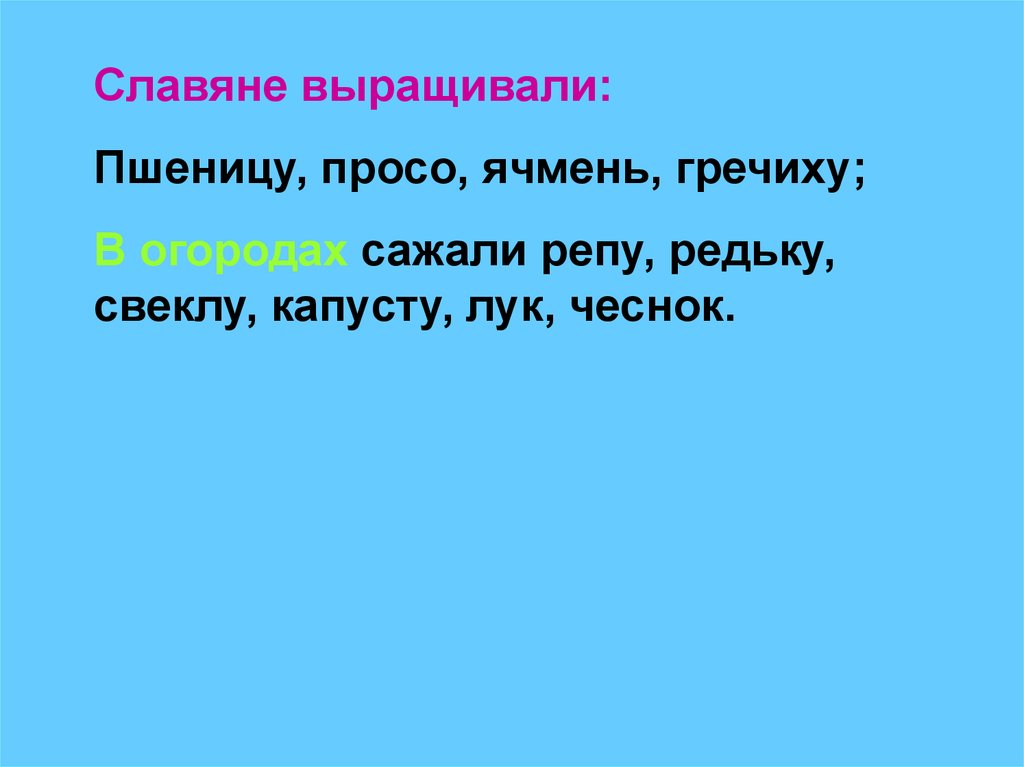 Славяне выращивали:Пшеницу, просо, ячмень, гречиху;