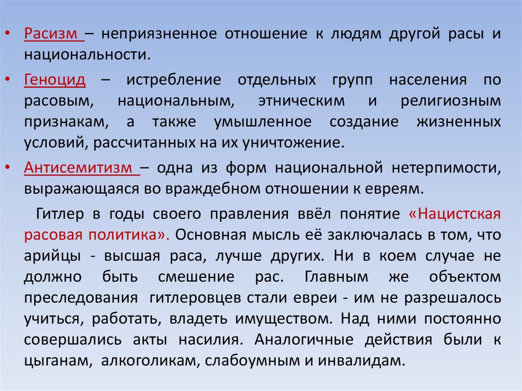 • Расизм – неприязненное отношение к людям другой расы инациональности.