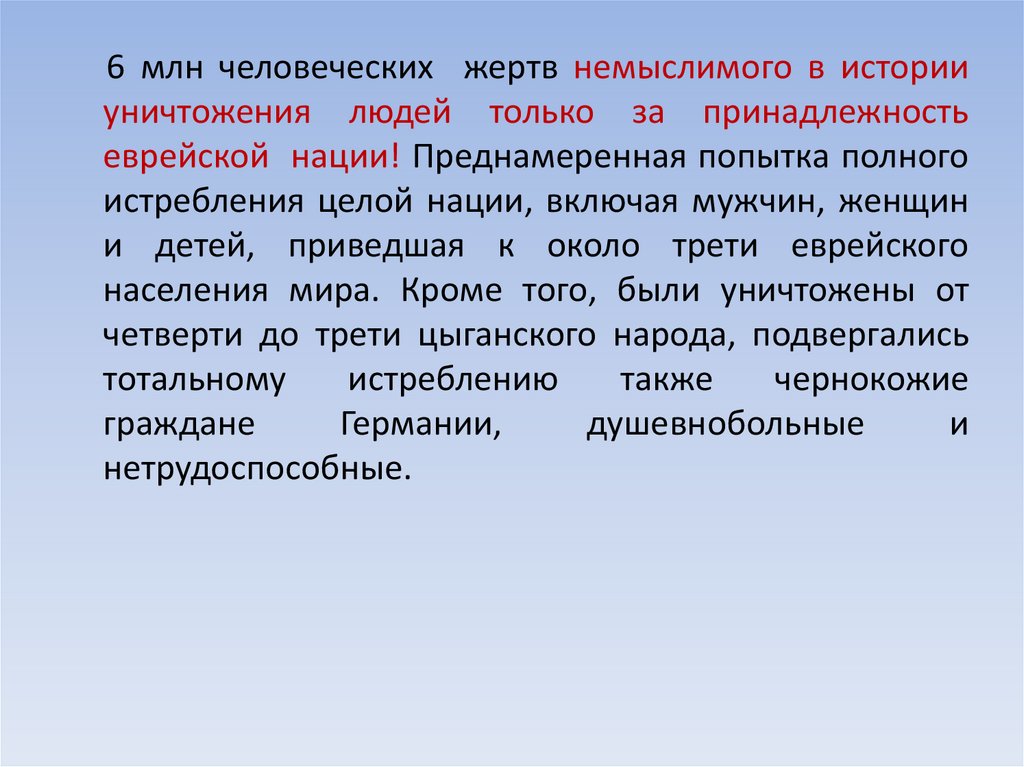 6 млн человеческих жертв немыслимого в историиуничтожения людей только за принадлежность