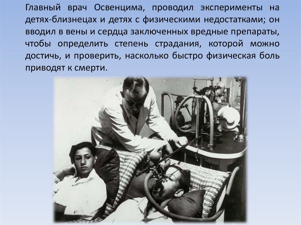 Главный врач Освенцима, проводил эксперименты надетях-близнецах и детях с физическими недостатками; он