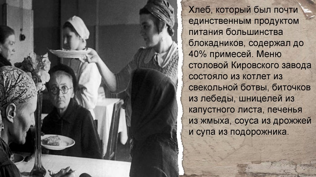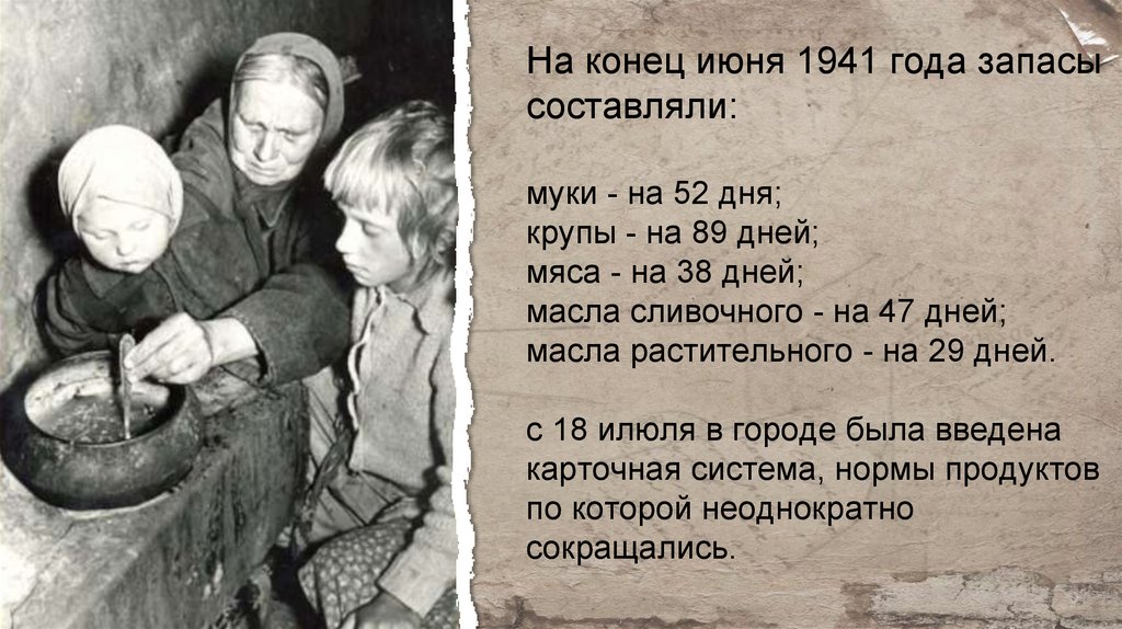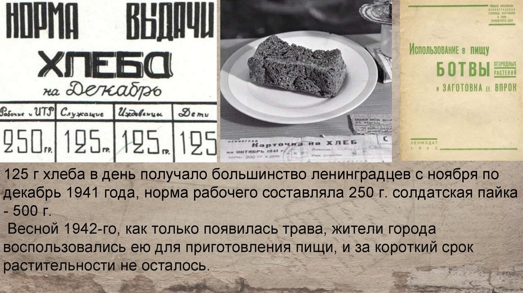 125 г хлеба в день получало большинство ленинградцев с ноября подекабрь 1941 года, норма рабочего составляла 250 г. солдатская пайка
