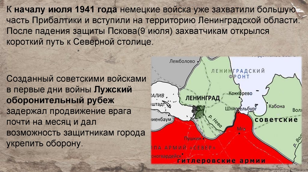 К началу июля 1941 года немецкие войска уже захватили большуючасть Прибалтики и вступили на территорию Ленинградской области.