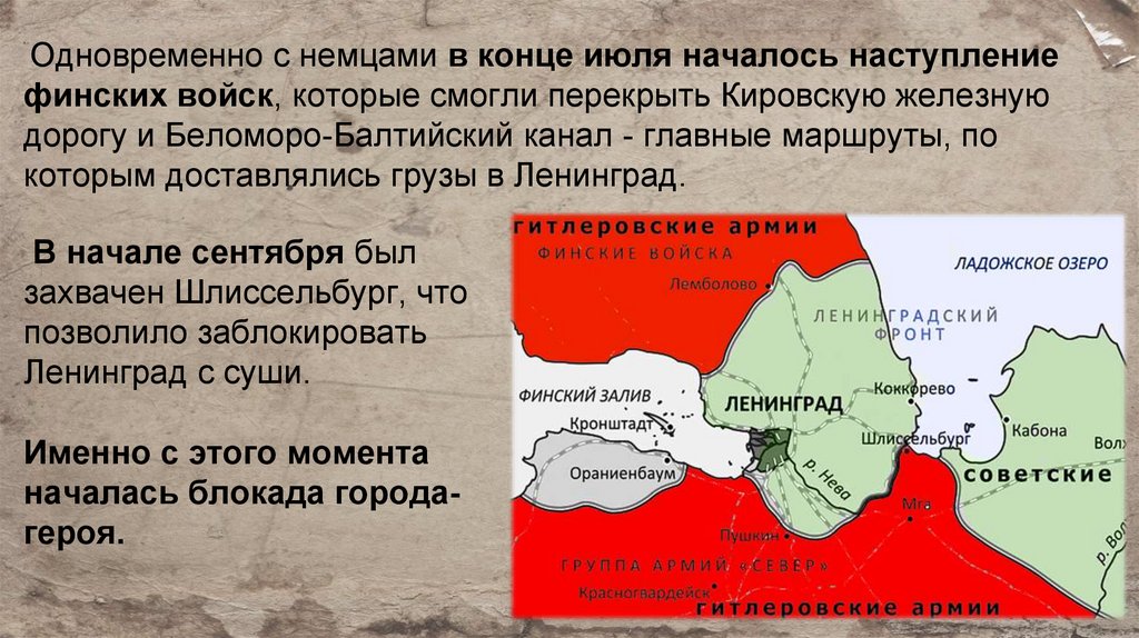 Одновременно с немцами в конце июля началось наступлениефинских войск, которые смогли перекрыть Кировскую железную