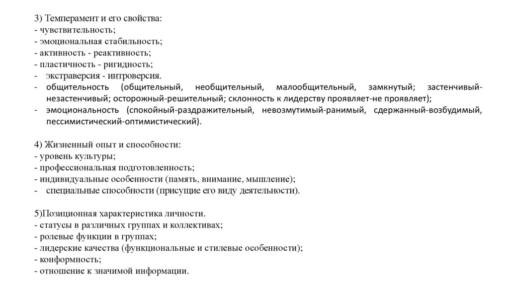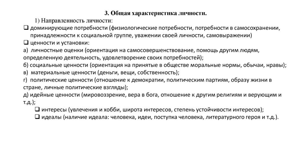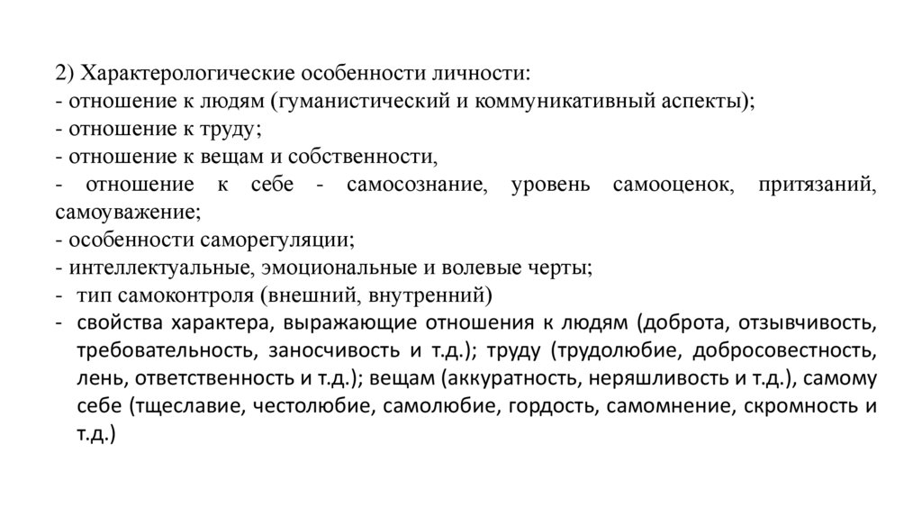 2) Характерологические особенности личности:- отношение к людям (гуманистический и коммуникативный аспекты);