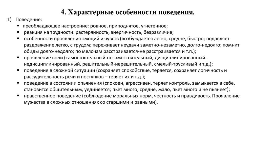 - общительность (общительный, необщительный, малообщительный, замкнутый; застенчивыйнезастенчивый; осторожный-решительный; склонность к лидерству проявляет-не проявляет);