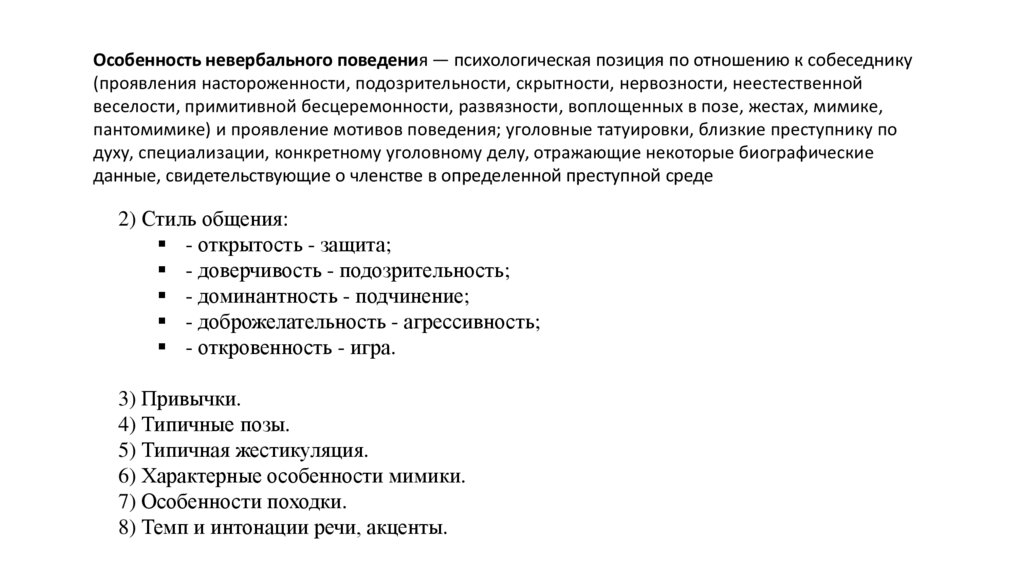Особенность невербального поведения — психологическая позиция по отношению к собеседнику(проявления настороженности, подозрительности, скрытности, нервозности, неестественной