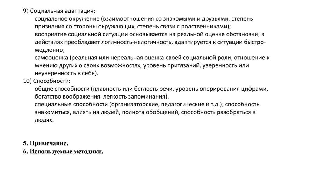 9) Социальная адаптация:социальное окружение (взаимоотношения со знакомыми и друзьями, степень