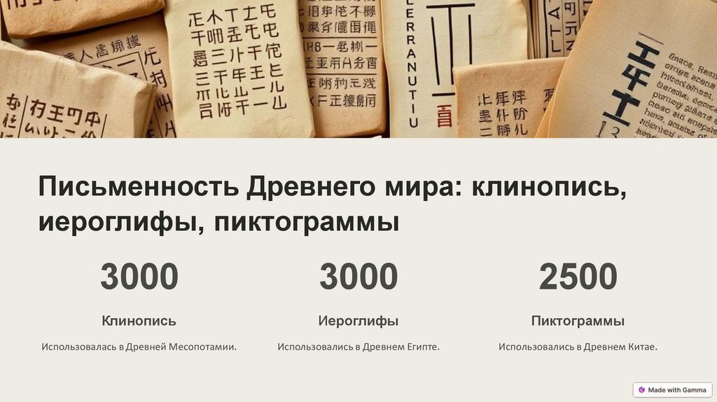 Письменность Древнего мира: клинопись,иероглифы, пиктограммы